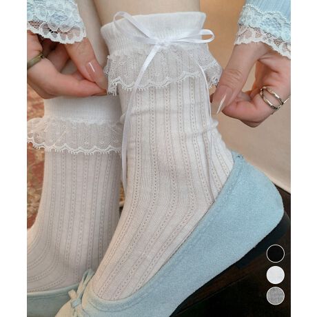 レースフリルとリボンがアクセントになったガーリーなミドルソックス。