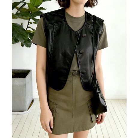 ツヤ感のあるフェイクレザーを使用した、トレンド感漂うベスト。