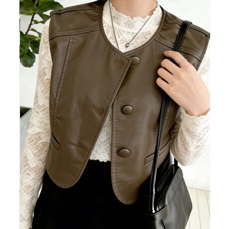 ツヤ感のあるフェイクレザーを使用した、トレンド感漂うベスト。