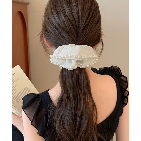 クラシカルな雰囲気漂う、フェイクパール付きボリュームシュシュ。