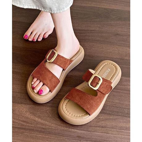 ゴールドバックルがアクセントになった、シンプルなデザインの厚底サンダル。