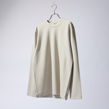 着回しやすいようネックラインの高さを抑えたモックネック長袖Tシャツ。