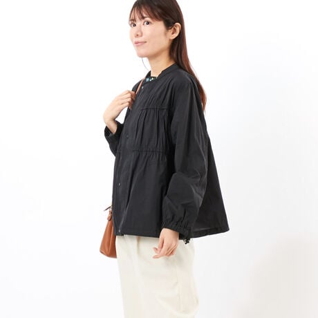 [型番:34140161]コットンナイロンワッシャーのギャザーブルゾン。軽くて着やすい素材です。フロントの2段のギャザーポイントが印象的な春らしい一着に仕上げました。前立ては太めにしてすっきり見えを意識しました。衿元のさりげない刺繍もポイントです。裾のドロストでニュアンスを変えてお楽しみいただけます。