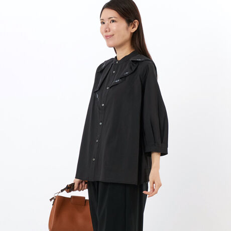 [型番:34150261]柔らかくしなやかな風合いが特徴のカルゼのブラウス。フロントにはドレープフリルをアシンメトリーに施しています。縁は単色系のお花の刺繍で上品にまとめました。後ろ裾には3段のタックを施し、シンプルながら印象的なブラウスです。