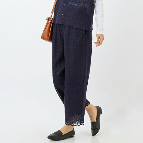 [型番:34160561]エンブロイダリーレースを贅沢使いしたレースパンツ。少し透け感のある生地に、パネル柄でボリューム感のある糸使いの生地にしました。チュニックやワンピースなどと合わせて、裾から見えるレースがテンションを上げるアイテムになっていいます。同素材のキャミベストとのセットアップコーディネートもおすすめです。裏地付きなので安心してご着用いただける、軽くてレーシーなパンツです。ウエストはゴム&紐で快適な履き心地。