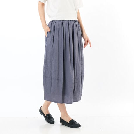 [型番:34170261]レーヨン麻ストレッチのギャザースカート。軽くて通気性が良く、伸縮性のある素材で、更にレーヨンが柔らかさを出しています。バルーンシルエットで、1枚でコーデにニュアンスを加えてくれる万能アイテム。両サイドのパイピングがさりげないアクセントになっています。ウエストはゴム&紐で快適な履き心地です。裏地付き。