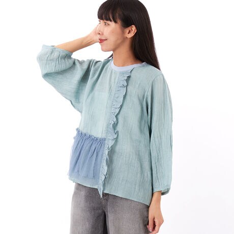 セルロース麻カルゼ+コットンボイル+ドットチュール フリルカットソー