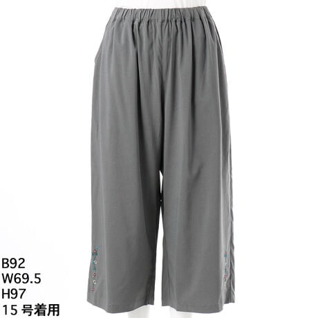 [大きいサイズ]レーヨンナイロンストレッチ フラワーワンポイント刺繍ワイドパンツ