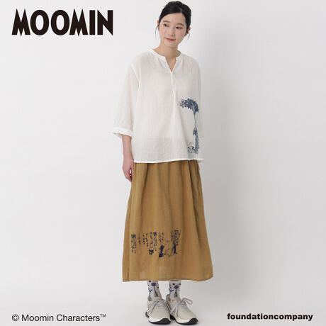 [大きいサイズ]セルロース麻ツイル「ムーミン一家の朝」刺繍ギャザースカート