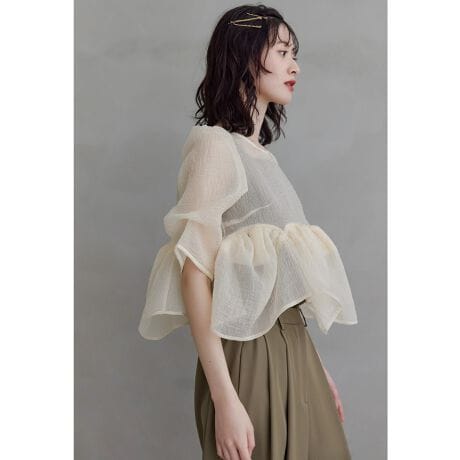 透けすぎないオーガンジーのペプラムトップスは、エアリーなボリューム感が魅力。