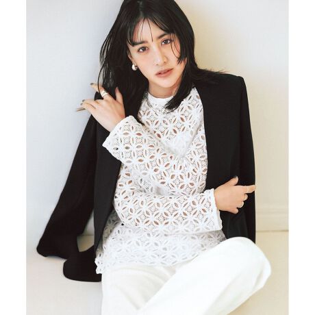 かぎ針風ラッセルレース素材のカーディガン。程よくタイトで、着用した際のラインを美しく見せるシルエットが魅力です。多めに取り付けたボタン使いがポイントで、一番下のボタンをウエスト付近に配置することで長めのスリットが生まれ、スタイルアップ効果も。羽織りとしてはもちろん、ボタンを留めてプルオーバーとしても使え、さらに前後着用可能な万能アイテムです。今年トレンドのレーシーアイテムは、デニムボトムと合わせたカジュアルコーデにもぴったりです。