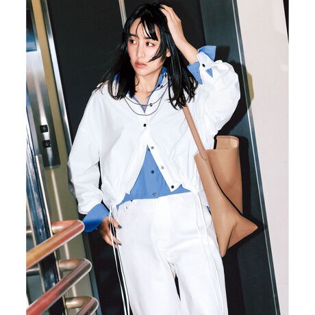 ■デザインノンアイロンで着用可能なイージーケア素材のデザインシャツ。ドロストディティールがポイントで、紐をしぼってお好みのシルエットに調整いただけます。程よい丈感で、ボトムスにインしなくてもサマになるデザインに仕上げています。ボタンをあけて羽織としても活躍する、汎用性の高いアイテムです。