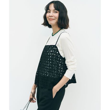■デザインかぎ針風のレーシーな素材が魅力のクロップド丈キャミソールと、トレンド感のあるシアーロンTシャツのセットアイテム。重ねて着るだけで、今年らしいのトレンドスタイリングが完成します。キャミソールの華奢な肩紐は長さ調節が可能で、フィット感も自在です。シーズンレスで活躍する、軽やかなレーシー素材のアイテムです。