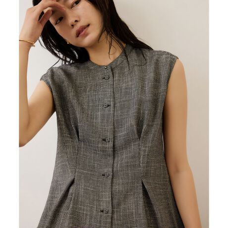 フロントには4か所のタックが入り、ペプラム風にふんわり広がるデザインでウエストラインをすっきり見せます。フレンチスリーブで肩まわりをすっきり見せるため、動きやすさも◎