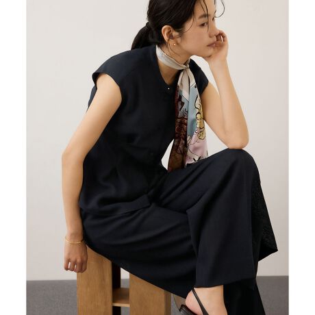 同素材のワイドパンツと合わせると、フロントタックがつくるペプラム風シルエットが際立ち、美しいラインを演出。セットアップで統一感のある通勤スタイルにもおすすめです。