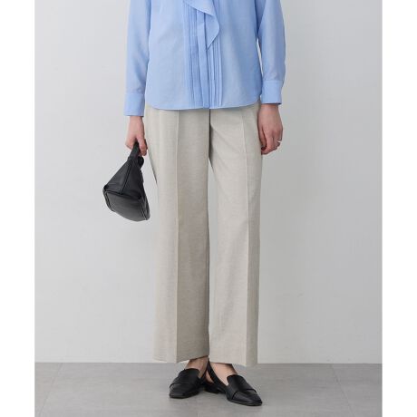 ■デザインセンタープレス入りのワイドパンツです。ウエスト部分にゴムを内蔵させたスマートバック仕様で、ラクな穿き心地ながらトップスINもきれいに決まります。また、ノータックでウエスト回りもすっきりとした印象に。トップスを選ばず、通勤にも休日のお出かけなど幅広いシーンで活躍する万能アイテムです。