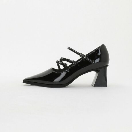 アッパーに斜めにかかる2本のベルトが目をひくパンプス。