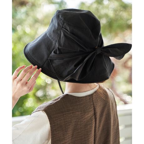 首元までしっかり覆うツバ広デザインで、紫外線対策に心強いリボンハット。