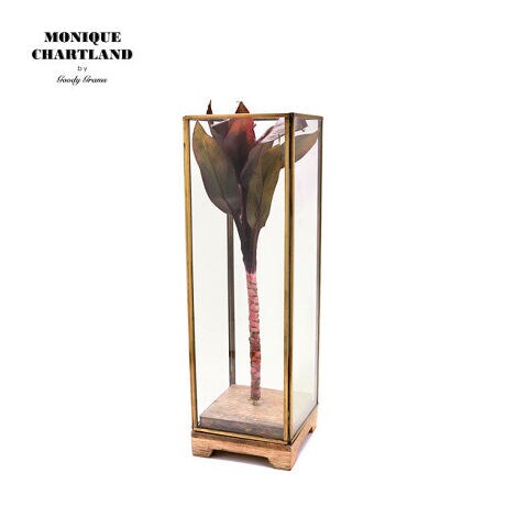 真鍮のフレームと土台のウッドが特徴的なディスプレイスタンドです。アンティーク調の佇まいでドライフラワーや造花を飾るのに最適です。Lサイズは丈のある枝物のフラワーベースとしてもご使用いただけます。(水入れ不可)