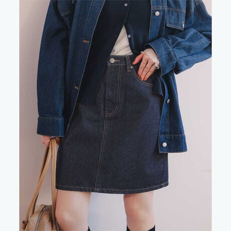 ・無駄のないシンプルなデザインなので、色んなトップスと相性が良いベーシックなミニスカート・ボディラインを拾いすぎない台形シルエットでスタイルアップ効果あり・オールシーズン着用でき、程よいハリ感のあるデニム素材を使用[型番:AFXT0257]