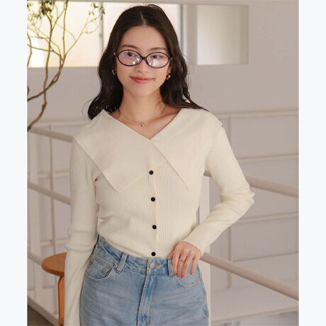 ・存在感のあるビッグカラーが顔まわりを華やかに見せる、主役級リブニットトップス