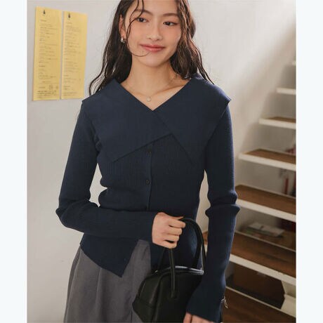 ・存在感のあるビッグカラーが顔まわりを華やかに見せる、主役級リブニットトップス
