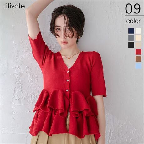 ・ランダムフリルヘムが目を惹く半袖ニットカーディガン