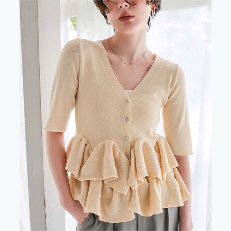 ・ランダムフリルヘムが目を惹く半袖ニットカーディガン
