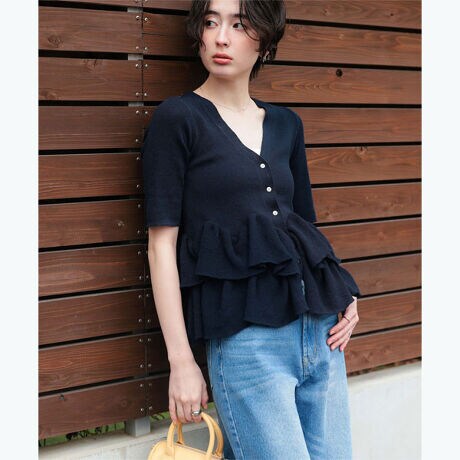 ・ランダムフリルヘムが目を惹く半袖ニットカーディガン