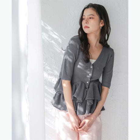 ・ランダムフリルヘムが目を惹く半袖ニットカーディガン
