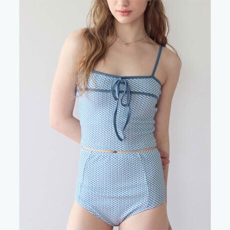 ・すっきりとしたシルエットに映えるリボンデザインのジャガードビキニ。