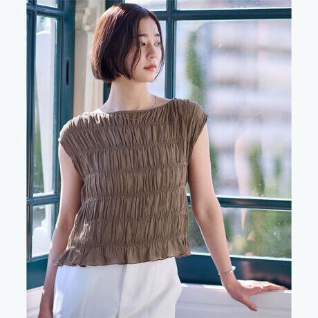 繊細なシャーリングを全体に施した、着映え感のあるブラウス。立体的なギャザーが華やかさをプラスしつつ、伸縮性があるため着心地は軽やか。肩にかかるフレンチスリーブは、二の腕をさりげなくカバーしてくれるデザイン。裾のフリルが腰まわりをふんわり見せ、コンパクトながら女性らしいシルエットに仕上がります。一枚で主役になるトップスで、デニム合わせのカジュアルからスカート合わせのきれいめスタイルまで幅広く活躍します。[型番:BHXU2061]