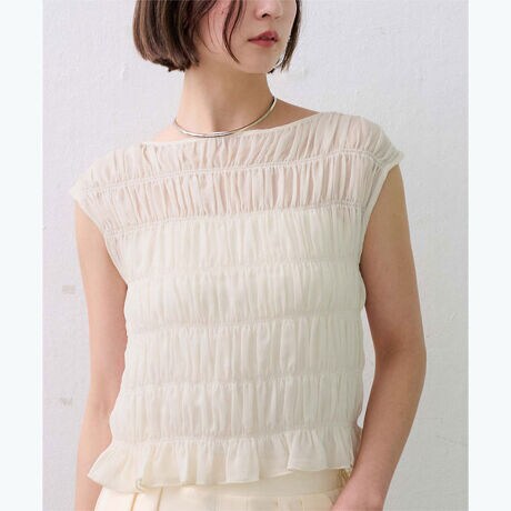 繊細なシャーリングを全体に施した、着映え感のあるブラウス。立体的なギャザーが華やかさをプラスしつつ、伸縮性があるため着心地は軽やか。肩にかかるフレンチスリーブは、二の腕をさりげなくカバーしてくれるデザイン。裾のフリルが腰まわりをふんわり見せ、コンパクトながら女性らしいシルエットに仕上がります。一枚で主役になるトップスで、デニム合わせのカジュアルからスカート合わせのきれいめスタイルまで幅広く活躍します。[型番:BHXU2061]