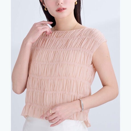 繊細なシャーリングを全体に施した、着映え感のあるブラウス。立体的なギャザーが華やかさをプラスしつつ、伸縮性があるため着心地は軽やか。肩にかかるフレンチスリーブは、二の腕をさりげなくカバーしてくれるデザイン。裾のフリルが腰まわりをふんわり見せ、コンパクトながら女性らしいシルエットに仕上がります。一枚で主役になるトップスで、デニム合わせのカジュアルからスカート合わせのきれいめスタイルまで幅広く活躍します。[型番:BHXU2061]