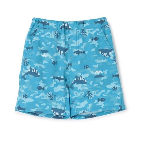 ユニークなデザインが可愛い選べる3柄展開の5分丈パンツです。黄色は乗り物柄、ライトグリーンは恐竜アロハ柄、ブルーはピクセル迷彩の魚柄。水が溜まらないようにポケットをメッシュ素材にした、水陸両用のアイテムです。内側にお名前を記入できるタグつき。【おすすめの着用時期は春夏シーズン】