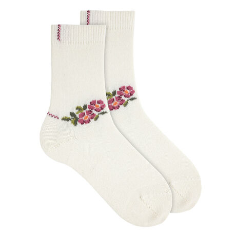 ●正面にはお花の柄、履き口とかかと部分にはピンクのラインが入っています。