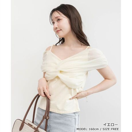異素材の組み合わせが目を惹く、フェミニンなオフショルダーカットソー。