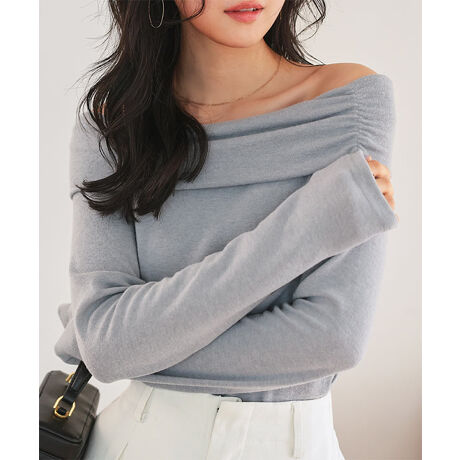 デコルテを美しく引き立てる、上品なオフショルデザインのカットソートップス。