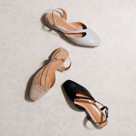 甲に掛かる斜めベルトが女性らしいシルエットを描き、足元をすっきりと見せてくれるバックストラップシューズ。片手でさっと履ける手軽さも、嬉しいポイントです。