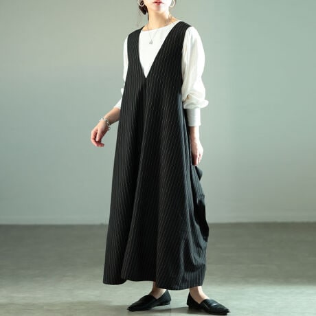 ピンストライプ柄のデザインでスタイリッシュ感が漂うジャンパースカートは、変形シルエットがモード感をプラスし、甘さを削ぎ落した大人な一着。気分やシーンによって、シルエットの変化を楽しめ、インナーを変えるだけでロングシーズン着用できるのも嬉しいポイント。身頃の両サイドにあしらわれたボタンを留めれば、すっきりとしたシルエットに。ボタンは前後どちらでも留めることが可能です。ボタンを外した状態でも落ち感が生まれ、美しいドレープを描きます。深いVネックが顔周りをすっきりさせ、足首が見えるロング丈で重たくなくすっきりと。