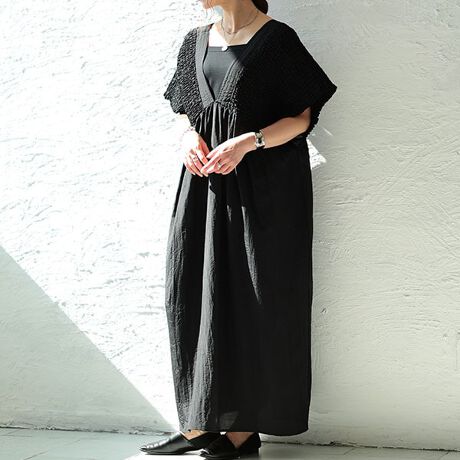 スリーブにたっぷりのシャーリングを施したデザインが魅力的なシンプルなワンピースは、ナチュラルな印象に、大人の色っぽさをひと匙プラスしたような雰囲気漂う一着。バックリボンがあしらわれ、後ろ姿まで愛らしいデザインで、どこから見てもサマ見えに。ざっくり深めのVネックが顔周りをすっきりさせ、満足感のあるフレンチ風スリーブがすっぽり二の腕を隠してくれます。胸下の山形切替がシャープなラインを描きつつ、脚長効果を発揮。全体的にゆったりとしたシルエットでラインを拾わず、広がり過ぎないスカートですっきり見え。