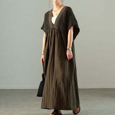 スリーブにたっぷりのシャーリングを施したデザインが魅力的なシンプルなワンピースは、ナチュラルな印象に、大人の色っぽさをひと匙プラスしたような雰囲気漂う一着。バックリボンがあしらわれ、後ろ姿まで愛らしいデザインで、どこから見てもサマ見えに。ざっくり深めのVネックが顔周りをすっきりさせ、満足感のあるフレンチ風スリーブがすっぽり二の腕を隠してくれます。胸下の山形切替がシャープなラインを描きつつ、脚長効果を発揮。全体的にゆったりとしたシルエットでラインを拾わず、広がり過ぎないスカートですっきり見え。