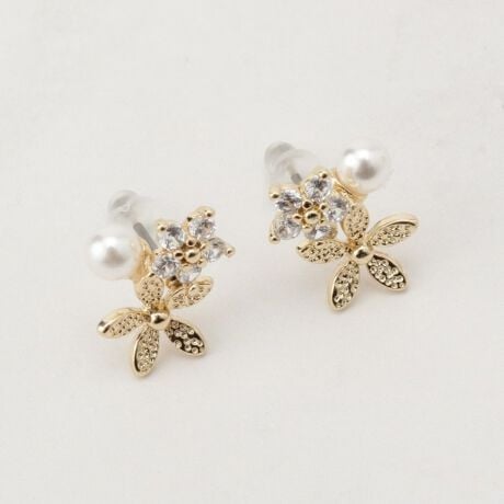 [型番:76985043]メタルとビジューのフラワーモチーフのスタッドピアス。【デザイン】メタルとビジューでフラワーモチーフをかたどったデザインのピアス。小ぶりなフェイクパールが上品な印象です。※照明の関係により、実際よりも色味が違って見える場合があります。また、パソコン・スマートフォンなどの環境により、若干製品と画像のカラーが異なる場合もございます。