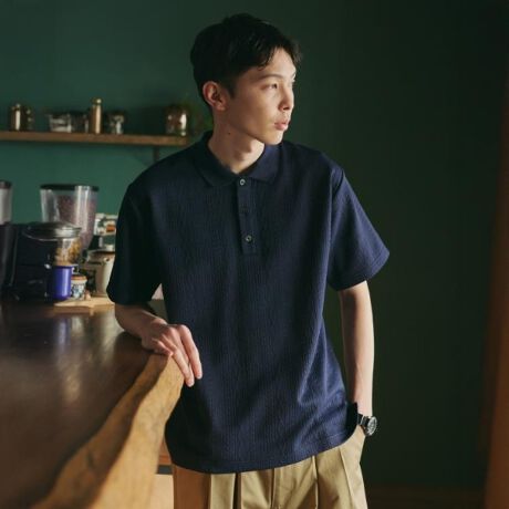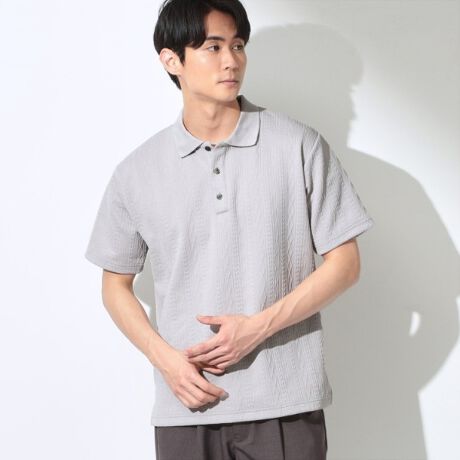 立体感のあるふくれキルトのタテ柄が特徴の半袖ポロシャツ。