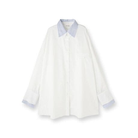 襟とカフスにデザインを加え、サックスシャツに白シャツをレイヤードしているような配色。