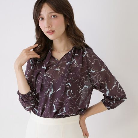 シアーな花柄素材を使用したタイ付きブラウス。