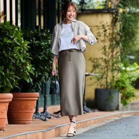 ロゴTシャツやブラウスなどに合わせたキレイめカジュアルスタイリングがおすすめです。