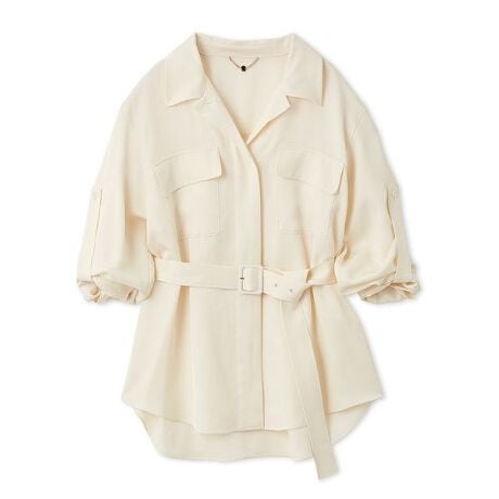 また、左脇のボタンを活用してカシュクールにアレンジしたり、袖をロールアップして固定できるタブをあしらったりと、着回し力を高める工夫も。