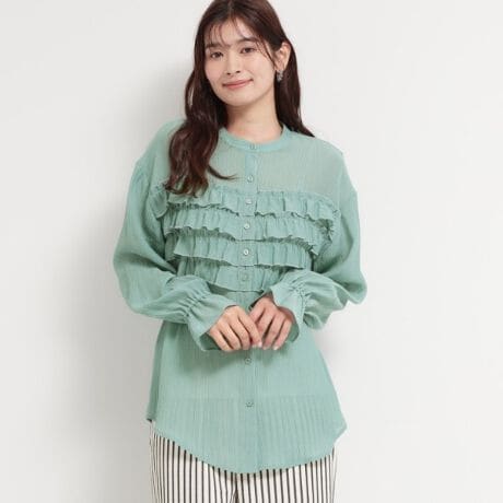 フロントにティアードフリルをさりげなく配したバンドカラーシャツ。