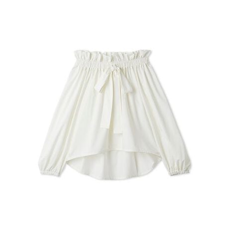 襟ぐりはゴム仕様で、オフショルとしてもワンショルとしても、またフリルカラーのブラウスとしても着用可能な3WAY。